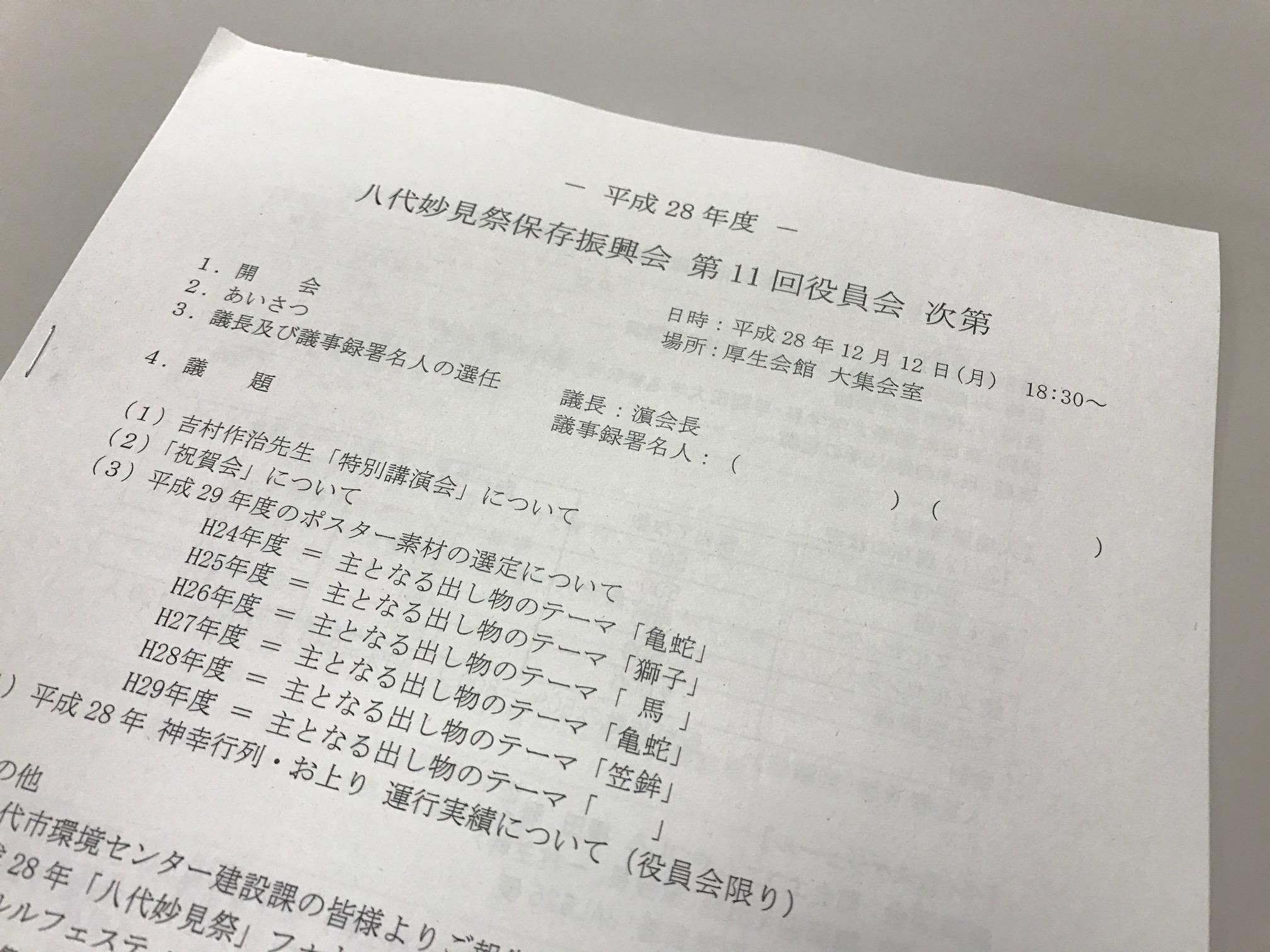 2016年12月12日 / 最終更新日時 : 2016年12月12日 myoukencom 保存振興会 第11回役員会 開催 祭りは終わりましたが妙見祭の活動は、通年を通して行われています この積み重ねが11月の本祭の賑わい作り、安全運行に繋がっております FacebookXCopy